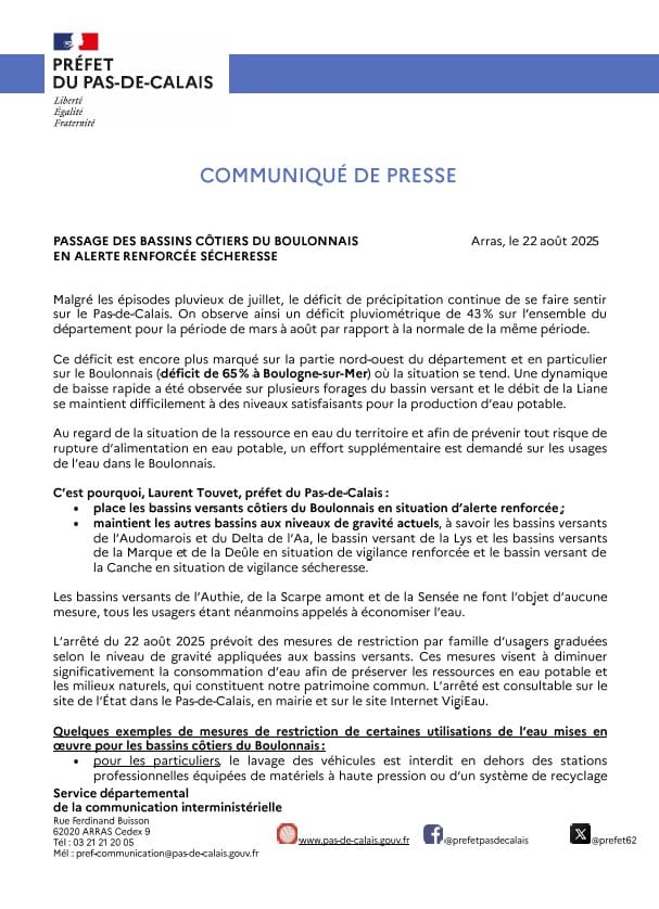 ❗Depuis le 22 août, les bassins côtiers du Boulonnais sont placés en alerte sécheresse renforcée.